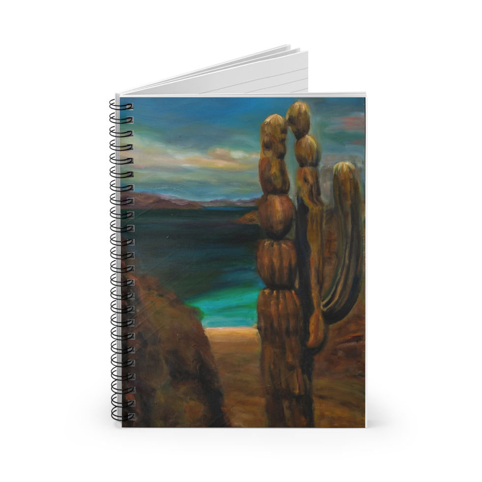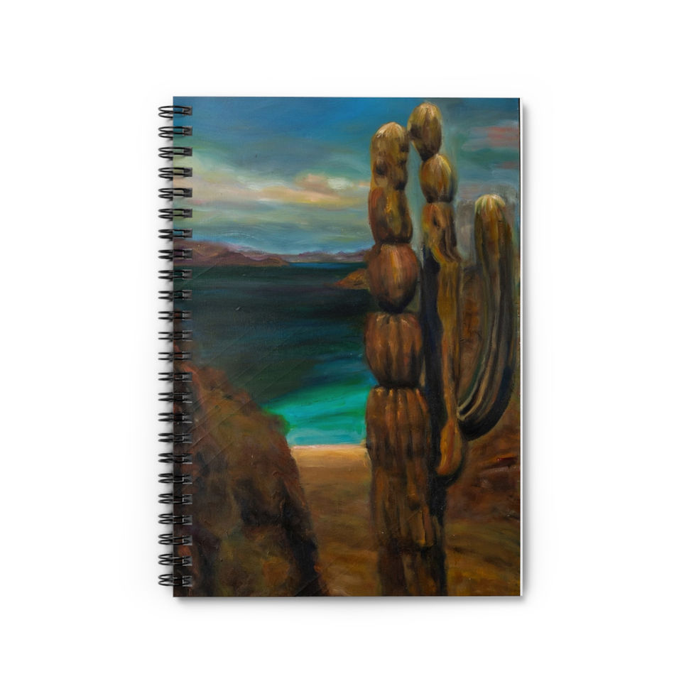 This spiral notebook carries a warm, desert-dusk mood—rough-hewn cactus silhouettes against a coastline. The ruled 90gsm pages feel substantial under pen and pencil, so thoughts, lists, and sketches sit cleanly on the page. A sturdy metal spiral lets the notebook fold back for one-handed writing and makes removing sheets simple. Inside the back cover a slim document pocket keeps ticket stubs, receipts, or loose notes at hand. At 6" x 8" it slips into backpacks and tote bags without weighing you down, and the dark grey back cover keeps the look grounded and everyday-ready. Use it for field notes, travel journaling, study, or daily planning—this notebook invites quiet, focused moments and the kind of slow observation that turns small details into stories.